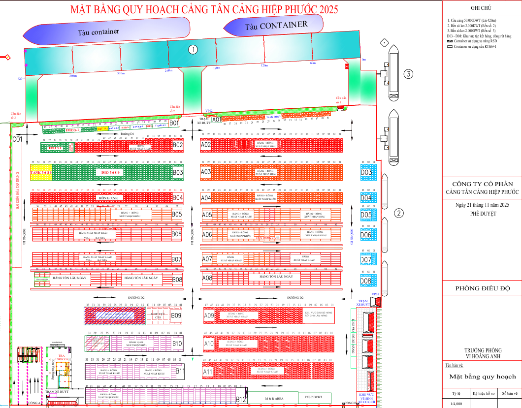 - Tiếp nhận tàu trọng tải: 50.000 DWT (độ sâu trước bến:-13,4m Sông Soài Rạp), 2.000 DWT (Sông Đồng Điền)
